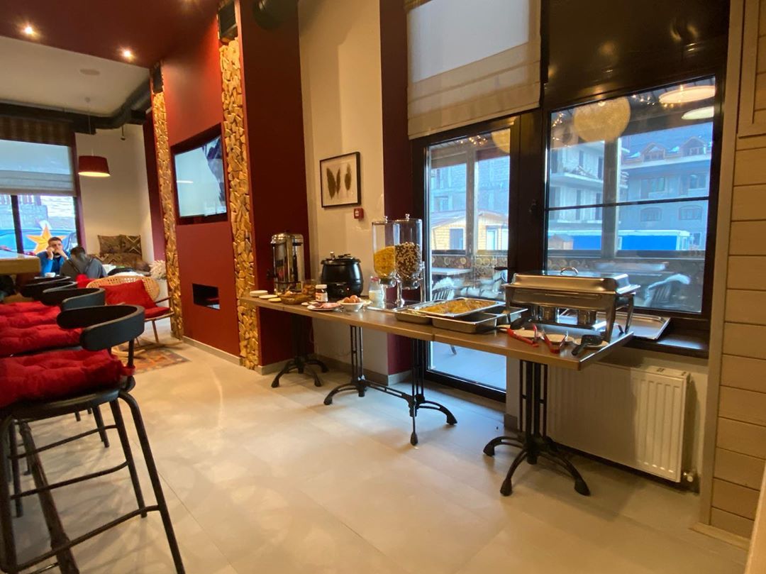 На территории находится кафе, где каждое утро сервируется шведский стол. Знаменит отель и своей террасой с видом на